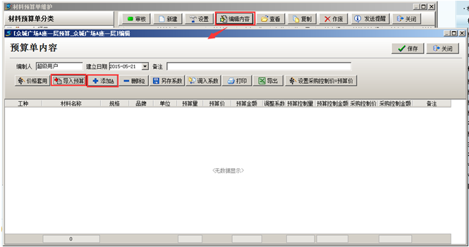 第二步,預(yù)算單名稱維護(hù)好之后,選中預(yù)算單點(diǎn)擊[編輯]的按鈕編輯“材料預(yù)算單”內(nèi)容,編輯預(yù)算單內(nèi)容有兩種方式,可“導(dǎo)入預(yù)算”或者點(diǎn)擊[添加]的按鈕直接選擇預(yù)算材料,如圖:
