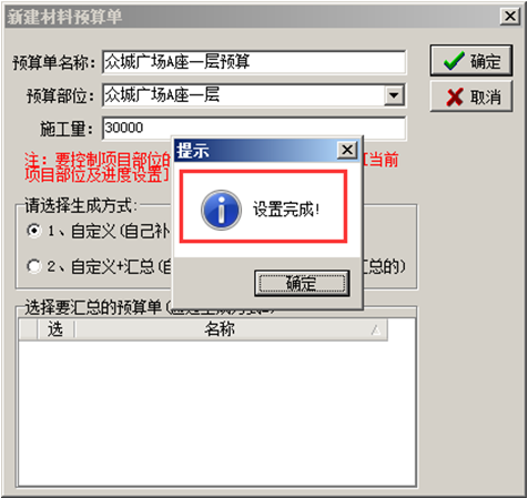 編輯材料預(yù)算單的基本信息,基本信息輸入完成之后點(diǎn)擊[確定]的按鈕,彈出“設(shè)置完成”的提示,如圖: