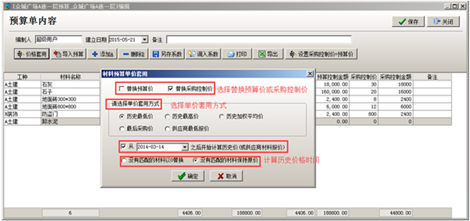 在進(jìn)行材料預(yù)算編輯時(shí),工程項(xiàng)目材料預(yù)算的單價(jià)可套用歷史采購(gòu)價(jià)價(jià)格。點(diǎn)擊“價(jià)格套用”,選擇好替換“預(yù)算價(jià)”或“采購(gòu)控制價(jià)”,選擇單價(jià)套用方式,以及沒(méi)有對(duì)應(yīng)材料時(shí)的替換方式,替換完成之后點(diǎn)擊確定,系統(tǒng)按照選擇的條件將價(jià)格進(jìn)行替換。如圖: