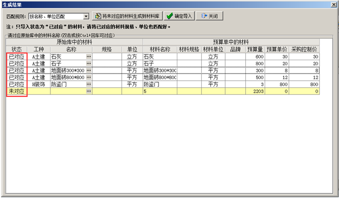 第三步,列名對(duì)應(yīng)好之后點(diǎn)擊[確定],將本地Excel中的內(nèi)容導(dǎo)入到系統(tǒng)中,如果預(yù)算單中存在與原始庫(kù)中未對(duì)應(yīng)的材料,可對(duì)應(yīng)之后[確定導(dǎo)入](對(duì)應(yīng)好之后后期如果有同樣的材料出現(xiàn)可自動(dòng)對(duì)應(yīng)),確定導(dǎo)入之后,文件中的內(nèi)容導(dǎo)入到系統(tǒng)中,點(diǎn)擊[保存]按鈕保存當(dāng)前材料預(yù)算單,如圖: