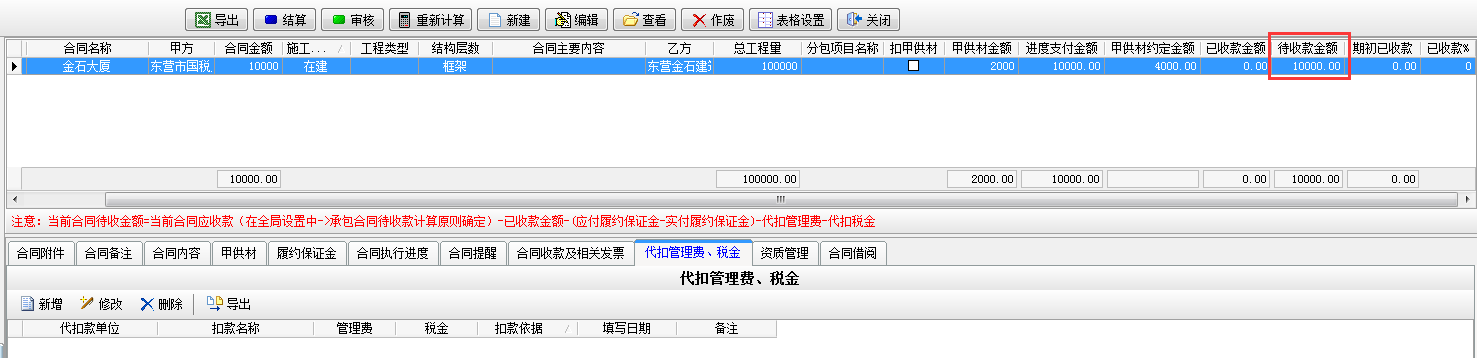 在工程項目資質掛靠管理中因為借用乙方B的資質,需要扣除管理費,如果需要乙方B代開發票還需要扣除稅金。在承包合同中[代扣管理費稅金]模塊下操作,如下圖: