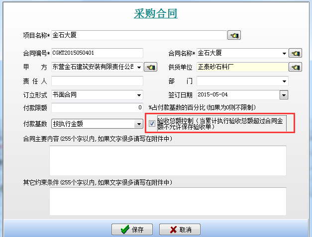在工程項(xiàng)目管理系統(tǒng)中即通過采購(gòu)合同驗(yàn)收總額控制選項(xiàng)來控制驗(yàn)收總額。