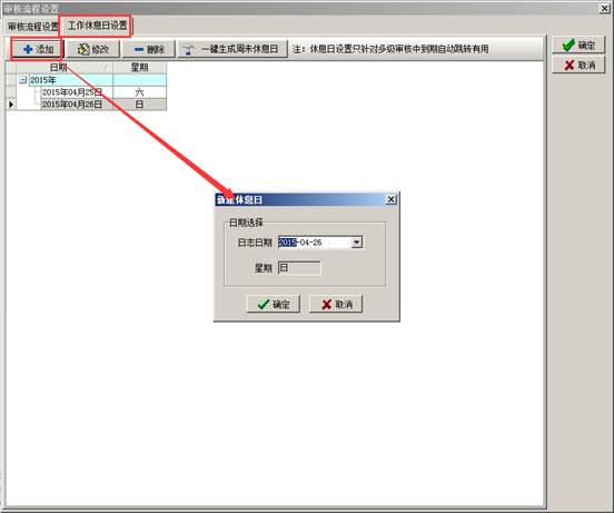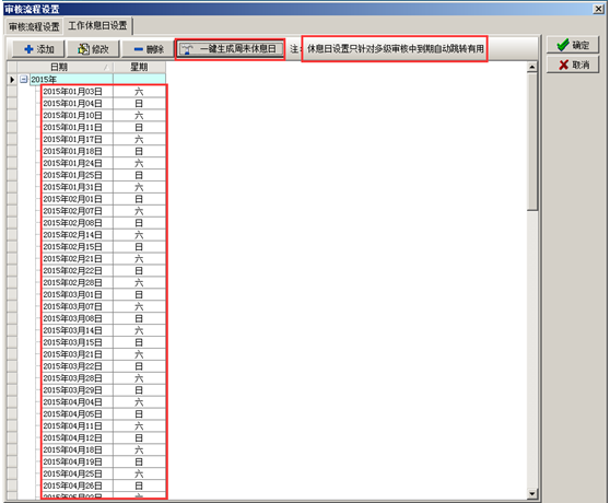 在系統(tǒng)中設置工作休息日,“一鍵生成周末休息日”,系統(tǒng)在跳轉(zhuǎn)審核時不會在休息日內(nèi)跳轉(zhuǎn),如圖: