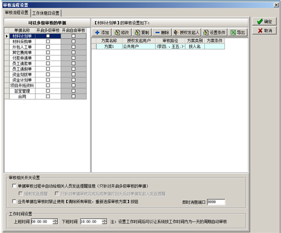 1、先由系統(tǒng)管理員設置好每個審核方案的每個審核級別的審核周期(如1天,2天,1個工作日,2個工作日等)、并設置好每天的上班時間 和下班時間。如早8:00 到下午18:00。