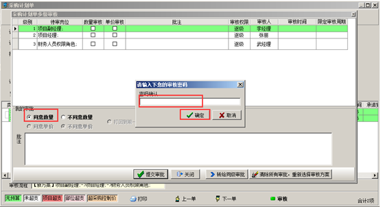 審核人審核時,選擇“我的審核”的選項,并輸入審核密碼,點擊“確定”按鈕,選擇下一位審核人,此時單據(jù)的審核狀態(tài)是“審核中”,如圖所示: