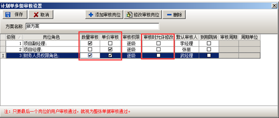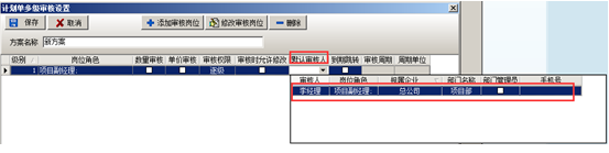 崗位角色以及用戶添加完成之后分別授權(quán)給相應的用戶(數(shù)量或者單價),或設置審核時可修改,設置完成之后點擊“保存”的按鈕,審核方案設置完成之后則授權(quán)發(fā)起人(按人名或者按崗位),在授權(quán)用戶的復選框內(nèi)打勾即可,如果授權(quán)給“公共用戶”則在“公共用戶”的復選框內(nèi)打鉤,被授權(quán)的用戶可在創(chuàng)建單據(jù)的時候選擇多級審核方案,如圖: