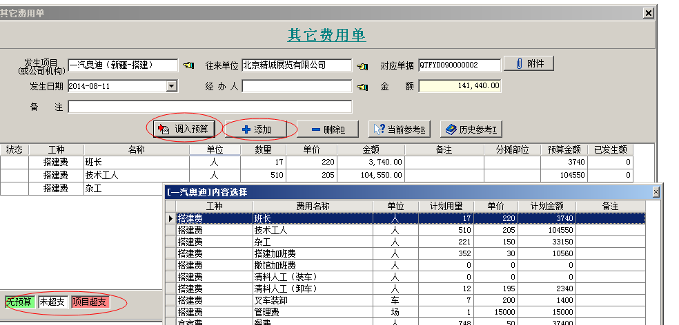 在單據(jù)中我們可以使用添加【按鈕】進(jìn)行添加,也可以使用【調(diào)入預(yù)算】功能,從預(yù)算里面調(diào)入。另外在單據(jù)中有預(yù)警機(jī)制,如果添加預(yù)算外的內(nèi)容就明細(xì)會顯示綠色,超過預(yù)算的就會明細(xì)顯示紅色。