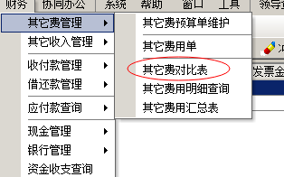 預(yù)算與實際對比,在財務(wù)菜單中第一項【其他費(fèi)管理】,【其他費(fèi)對比表】中查詢。