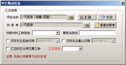 使用時選擇好項目,選擇好預(yù)算單,然后點(diǎn)【匯總】按鈕,進(jìn)行統(tǒng)計。
