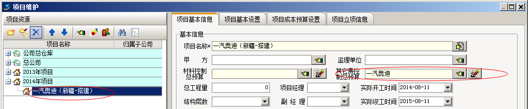 在預(yù)算單中,點(diǎn)【添加】按鈕就會彈出之前設(shè)定好的科目,以供我們選擇使用。添加完成后,點(diǎn)保存按鈕進(jìn)行保存。保存完成后,我們可以在工程管理模塊【項目維護(hù)】中進(jìn)行預(yù)算與項目綁定。