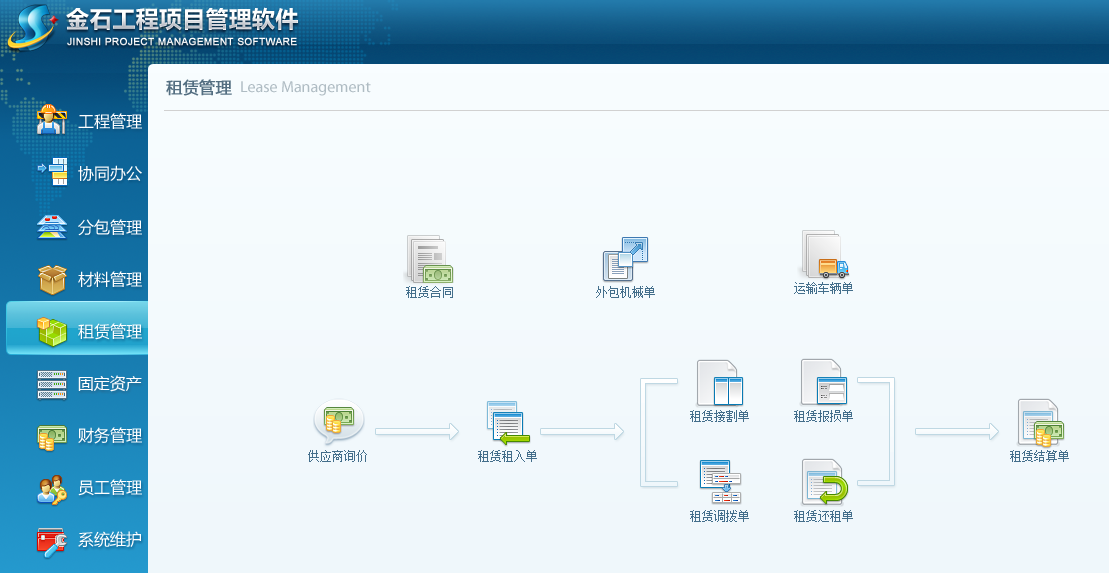 在建筑施工中,材料往往是通過采購或者租賃得來的。所以在建筑材料管理軟件中還要對租賃的材料進行對應的管理。建筑材料管理軟件針對材料租賃過程中的材料租入合同、材料租入、材料租入還租、材料租入報停和材料租賃結算實行一體化流程管理。建筑材料管理軟件中材料租入合同是租賃業務的指導性文件。合同簽訂之后,租入、歸還、報停的后續操作都圍繞合同而開展,甚至在進行租入結算時軟件會自動調用租入合同所采用的“日期計算方式”和所擬定的“日租金單價”。