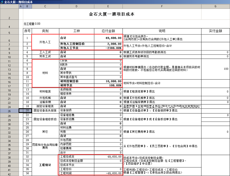 成本設置完成之后按照合同內容查詢項目成本,系統可將對應成本的控制總價與對應成本節余生成對比。如圖所示: