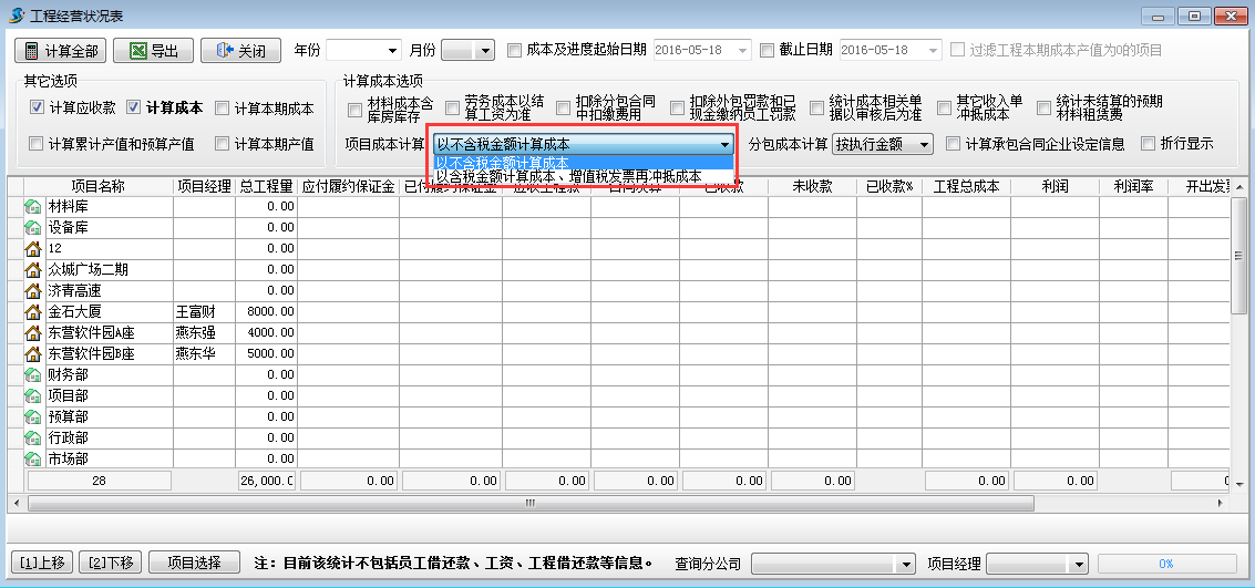 ⑵.營改增后項目成本利潤和工程經營狀況表可以選擇以“不含稅金額計算成本”或者“以含稅金額計算成本、增值稅發票在沖抵成本”兩種方式。如下圖: