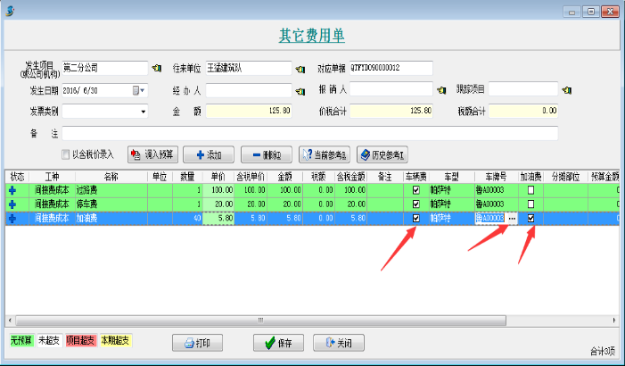 登記車輛日常費(fèi)用時(shí),[車輛費(fèi)]、[車型]、[車牌號(hào)]為必選項(xiàng),如果為這項(xiàng)費(fèi)用為“加油費(fèi)”,則需要在[加油費(fèi)]上打鉤。