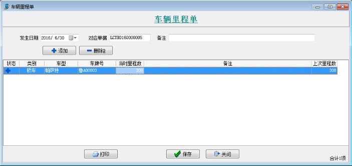 注:三個(gè)單據(jù)中“上次里程數(shù)”,系統(tǒng)自動(dòng)檢索之前最近的一個(gè)單據(jù)的“當(dāng)時(shí)里程數(shù)”,如果沒有最近的單據(jù)則為【內(nèi)部車輛維護(hù)】中所填寫的“期初里程數(shù)”。