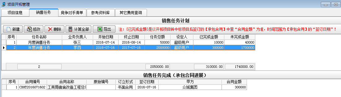 如上圖建立一個(gè)業(yè)務(wù)負(fù)責(zé)人為李四,任務(wù)總額為2000000的年度銷售任務(wù)。其中[已完成金額]是以開(kāi)拓項(xiàng)目轉(zhuǎn)中標(biāo)項(xiàng)目后簽訂的【承包合同】中里的“合同金額”為準(zhǔn),時(shí)間范圍為【承包合同】的“簽訂日期”![未完成金額]是[任務(wù)金額]減去[已完成金額]得出的金額。具體操作如下: