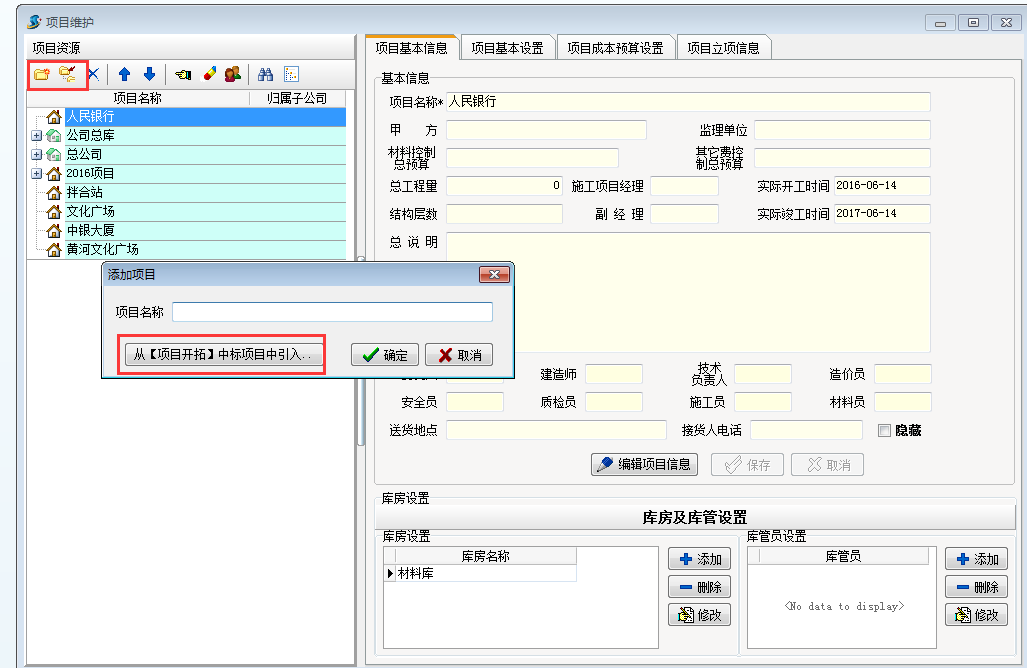 項(xiàng)目中標(biāo),在施工項(xiàng)目管理軟件項(xiàng)目維護(hù)建立項(xiàng)目,選擇從【項(xiàng)目開(kāi)拓】中標(biāo)項(xiàng)目中引入。如下圖: