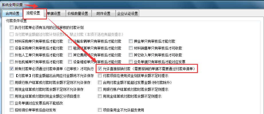 流程設置→允許直接報銷付款打鉤(需要報銷的單據不需要通過付款申請單)