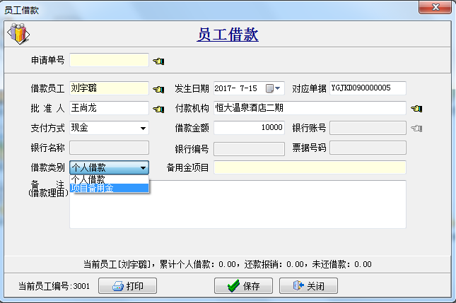 備注:員工借款分為個人借款和項目備用金,其中選擇項目備用金主要用于大額的采購,是??顚S玫?,不能用于其他項目