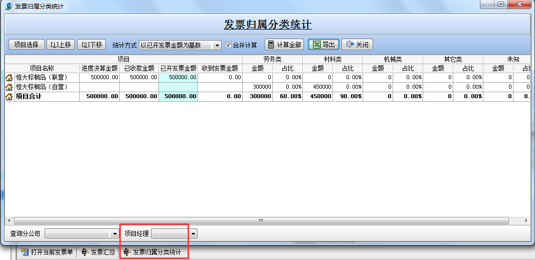 發票歸屬分類統計(在一個項目中應控制材料票、勞務票等所占的比例,此功能用于計算掛靠單位發票歸屬所占百分比)