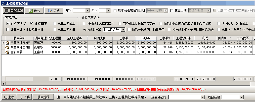 可查詢出項目(包括所有項目、某一子公司的項目、某資質(zhì)承接的項目、某項目經(jīng)理承包的項目、某開工年度的項目)結(jié)算進度、應(yīng)收工程款、已收款、未收款、工程總成本、完成產(chǎn)值、利潤、開出發(fā)票、收到發(fā)票等信息,并統(tǒng)計出目前可用資金余額。
