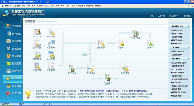 本軟件是金石軟件公司以眾多施工企業(yè)管理現(xiàn)狀為出發(fā)點,深入了解施工現(xiàn)場,經(jīng)過七年地不斷完善與努力,打造成為一款成熟、靈活、實用性極高的信息化內(nèi)控管理平臺。軟件以成本控制為核心,以資金管理為主線,全面解決項目管理難題,提升項目管控能力。對工程的投標(biāo)管理、中標(biāo)后的進度管理、分包管理、采購招標(biāo)、材料管理、租賃管理、固定資產(chǎn)管理、員工管理、勞務(wù)管理、資金管理、押金管理、發(fā)票管理、稅金核算、聯(lián)營管理、文檔資料管理、物資管理、安全質(zhì)量管理、證件管理、車輛管理、工程結(jié)算、等進行全方位管理,并提供強大的OA功能,能夠?qū)崿F(xiàn)各部門之間的數(shù)據(jù)共享及業(yè)務(wù)單據(jù)網(wǎng)上簽批審核。并且提供了強大的自定義工作流驅(qū)動和各種流程開關(guān),企業(yè)可根據(jù)自己情況自行設(shè)定,從而規(guī)范企業(yè)管理、讓工作流程正歸化、簡單化。通過工作流,讓信息送審、審批更貼近日常公司管理模式,申請人可隨時看到當(dāng)前業(yè)務(wù)的審批進度和各領(lǐng)導(dǎo)的審批意見。
