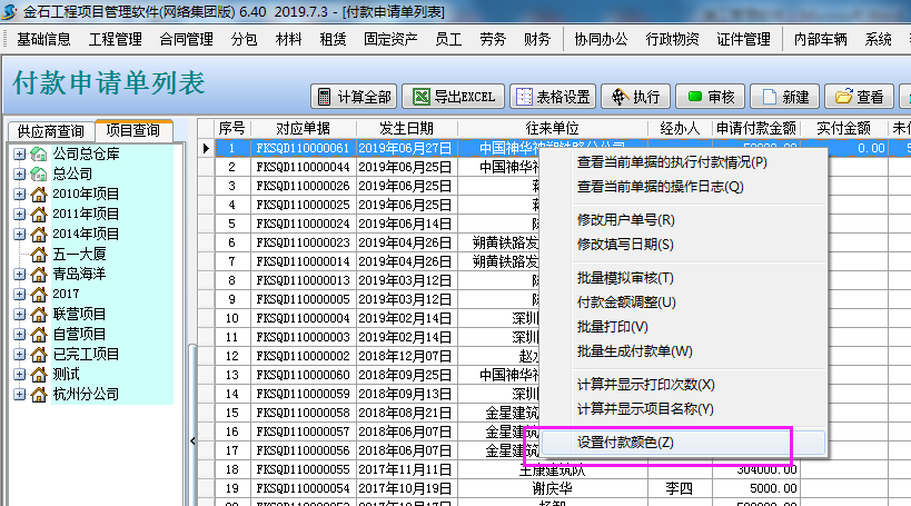 1、升級施工管理軟件最新版后,“財務(wù)管理”→“付款申請單列表”點擊鼠標右鍵,選擇“設(shè)置付款顏色”