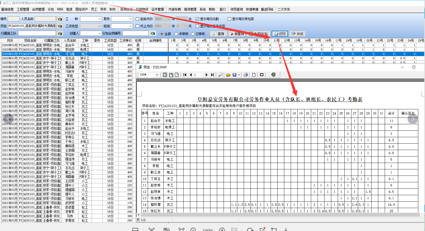 通過此功能,HR只需點擊打印按鈕,每日統計的勞務人員考勤信息將會自動按姓名進行歸檔、統計,自動形成以月份為單位的勞務考勤表。