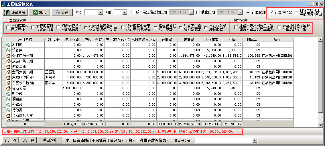 “工程經(jīng)營狀況表”用來查詢公司經(jīng)營狀況,進入“工程管理”的模塊,點擊“工程經(jīng)營狀況表”,查看所有工程項目的經(jīng)營狀況,可選擇計算成本的選項,如圖: