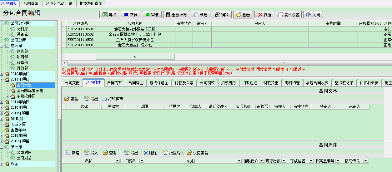 在【合同編輯】中左半部分是合同的分類,分包合同也是按【項目維護】進行分類管理的。一個項目下可以建立多個合同,窗口的右上部分是合同列表,一行信息代表一個合同。右下部位是當前合同相關的內(nèi)容:【合同附件】、【合同內(nèi)容】、【合同備注】、【履約保證金】、【合同提醒】、【合同付款及相關發(fā)票】、【合同罰款】、【扣繳費用】、【合同材料約定】、【資質管理】、【合同借閱】。