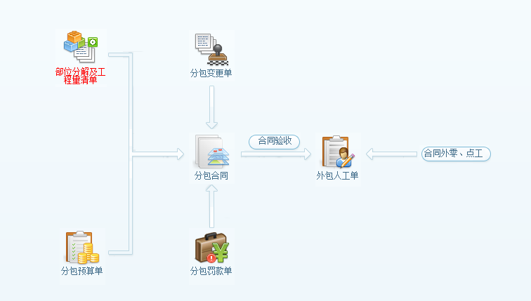 工程項(xiàng)目分包管理,可用于統(tǒng)計(jì)專(zhuān)業(yè)分包產(chǎn)生的成本及臨時(shí)雇用的零工成本。如軟件流程圖所示:分包成本是由外包人工單產(chǎn)成,其來(lái)源可分為兩部分,第一:來(lái)自分包合同中的合同驗(yàn)收,第二:來(lái)自合同外零、點(diǎn)工驗(yàn)收。