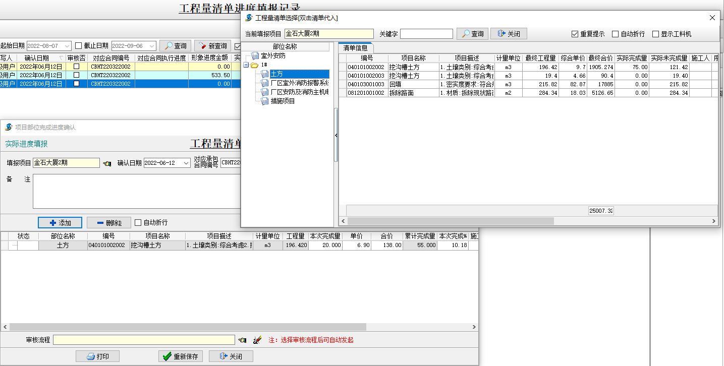 清單進度填報時,可以選擇形象進度或者實際進度,選擇實際進度時,點擊添加,在清單選擇界面,把要填報的清單雙擊帶入,然后依次錄入本次完成量或本次完成百分比,注意此時的單價帶入的是【部分分解及工程量清單】中的成本單價。