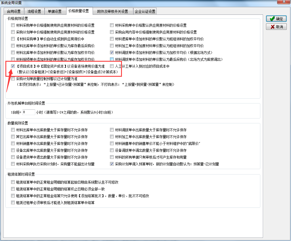 在工程項(xiàng)目管理軟件【系統(tǒng)維護(hù)】-【系統(tǒng)全局設(shè)置】-【價(jià)格數(shù)量設(shè)置中】有設(shè)備計(jì)算成本方式的控制開關(guān),如下圖: