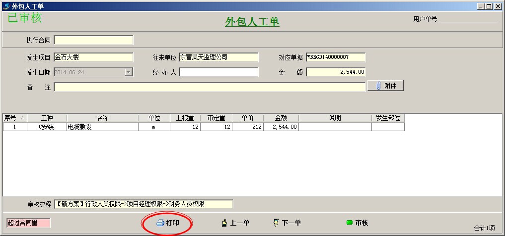 以下圖的外包人工單為例說明,點擊打印,選擇帶電子簽名的報表,點設計報表