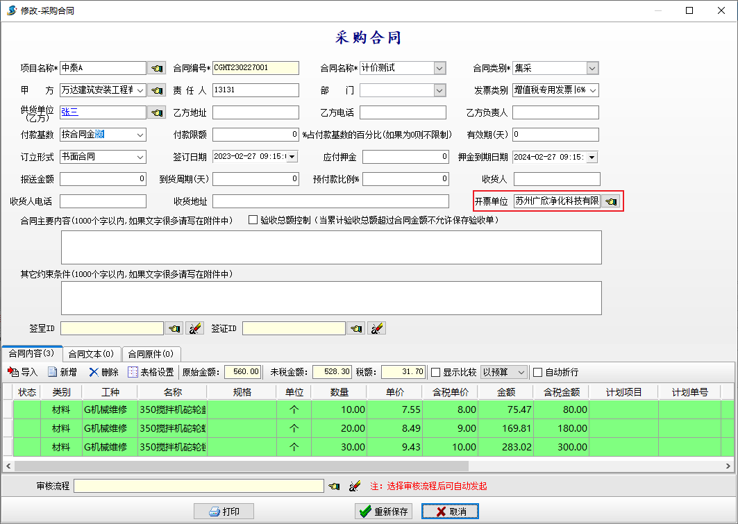 為了解決供貨單位和開(kāi)票單位不一致的情況,【采購(gòu)合同】增加“開(kāi)票單位”字段。如下圖所示: