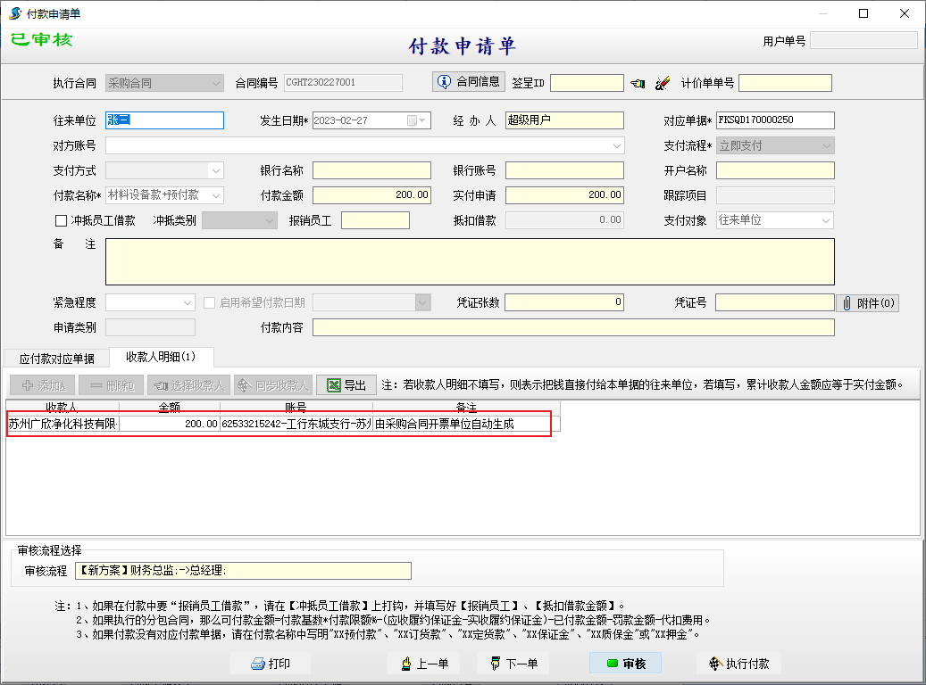 編輯合同時(shí),選擇開(kāi)票單位,合同付款時(shí),收款人明細(xì)中自動(dòng)帶入開(kāi)票單位收款信息。如下圖所示: