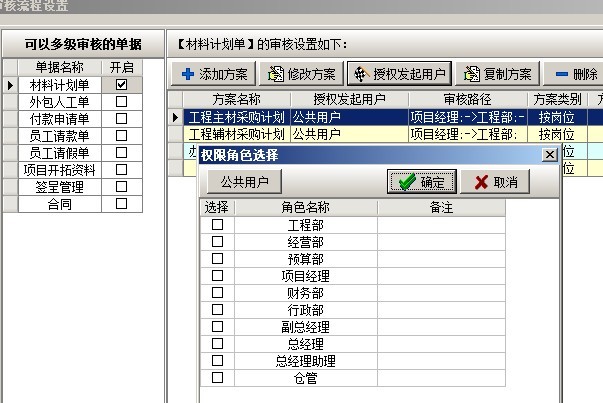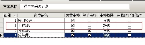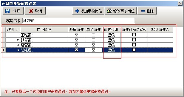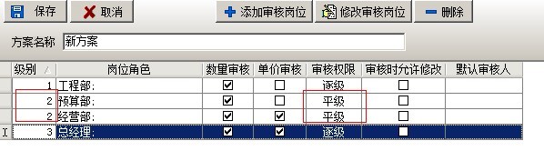 在多級審核中,可以設置多套審核方案,每套方案可設置多個崗位,可設置方案的授權發起用戶(在業務單據中選擇該審核方案的用戶)。在添加方案時,有三種方式逐級審核、平級審核、跨級審核。逐級審核是指各個崗位按先后順序依次審核該業務單據,例如審核順序為,工程部、預算部、經營部、總經理如下圖: