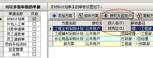 審核流程設置完成后,保存生效,然后再設置授權發起用戶,在新建審核方案的界面上,選中審核方案,點擊【授權發起用戶按鈕】。這是會彈出按人名和按崗位兩種模式,按人名授權就是在彈出的窗口中選中需要授權的用戶(其中公共用戶是指的全部用戶),按崗位授權就是在彈出的窗口中選中需要授權的崗位,統一崗位下所有用戶被授權。如下圖: