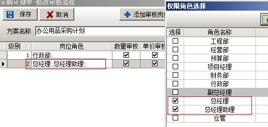 方案設置完成后,用戶在創建單據的時候根據不同的情況就可以選擇不同的方案,例如:如果公司行政部要采購辦公用品,那么他們在做采購計劃單的時候,審核方案就可以選擇辦公用品方案。如下圖: