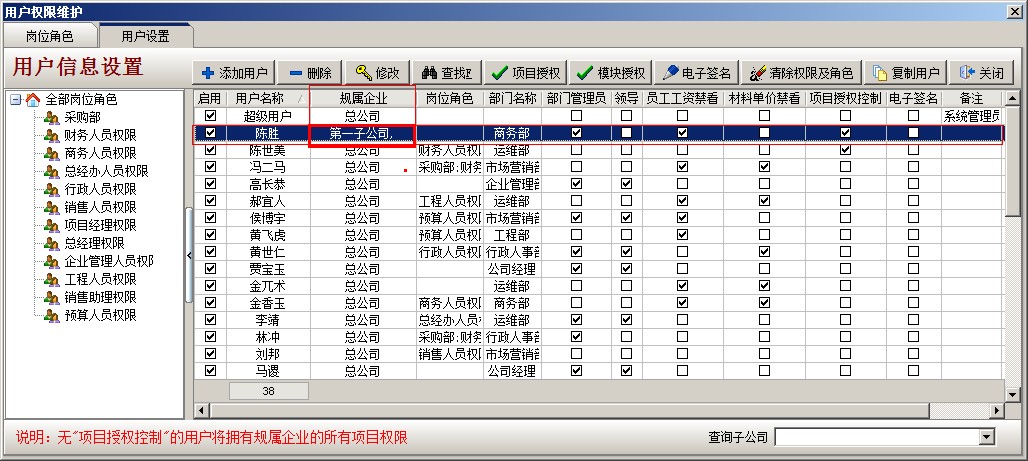 二、 項目按個人授權 (注:適合普通企業 或 集團公司下的分公司) 1、 以剛才陳勝為例,只讓他看到金石國際大廈 項目 (配合上面的項目按分公司授權,這樣就可以實現集團公司的項目二級授權)具體操作:登錄超級用戶---系統維護---打開用戶管理權限設置,選擇員工陳勝,點項目授權,開啟項目授權控制,在金石國際大廈這個項目前面打鉤