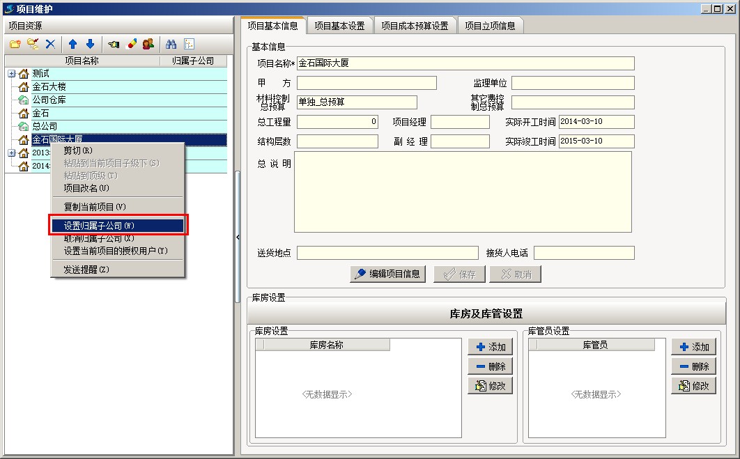 2、然后對項目進行子公司授權。打開工程管理---項目維護,在項目維護中的項目目錄中選擇需要設置的項目,右鍵,在下拉菜單中點擊設置歸屬子公司,在彈出的子